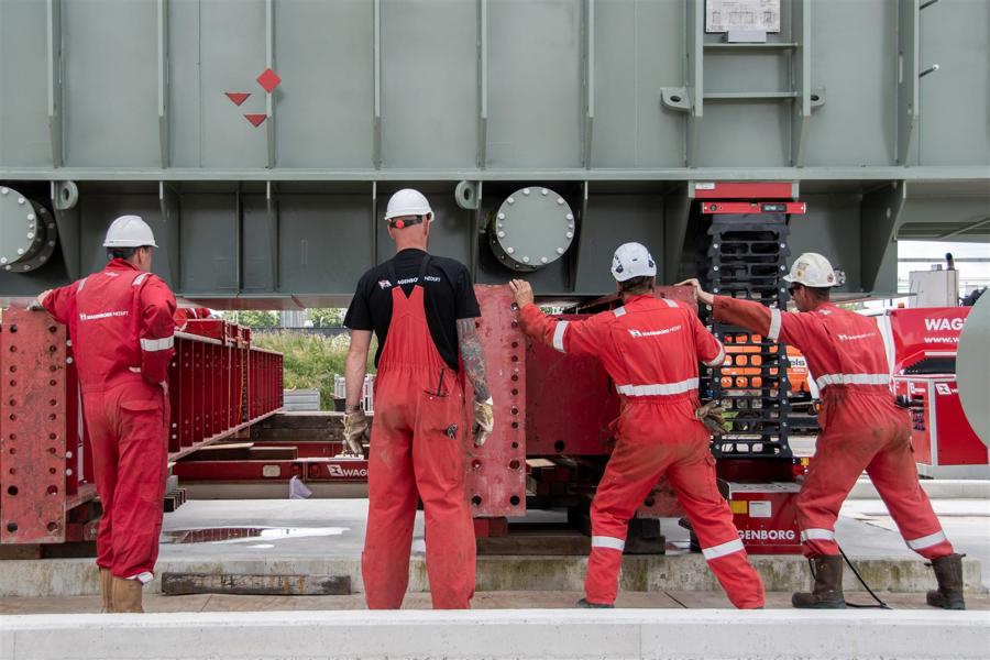 Met een 16-assige modulaire trailer zijn de transformatoren vanaf maandag 28 juni één voor één naar het hoogspanningsstation vervoerd. Direct vanaf de modulaire trailer zijn de transformatoren zijwaarts over het fundament gesleed en daarna afgevijzeld met behulp van het nieuwe Cube Jack System.